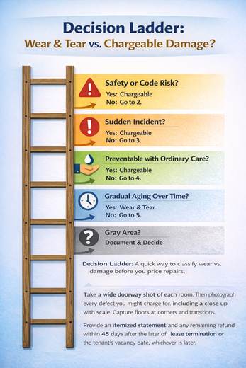 The Visual Decision Ladder graphic is a step-by-step checklist you can use the moment you spot an issue during a move-out inspection.