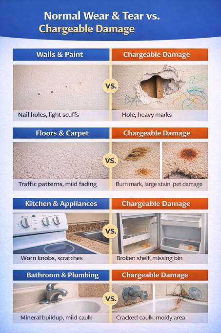 - Wear and tear is expected aging from ordinary use, while chargeable damage comes from negligence, misuse, or lease violations.