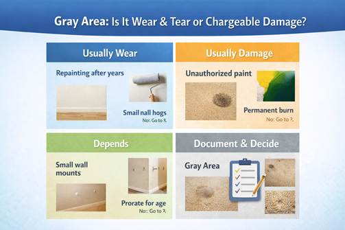 The last step, “Gray Area,” is for the situations that aren’t obvious. When you land there, the photo reminds you to pause and document before deciding. Compare move-in and move-out photos, take clear close-ups with scale, and choose the most reasonable repair approach rather than an upgrade.