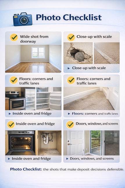 This Photo Checklist shows the exact shots to capture during move-in and move-out so your deposit decisions are easy to support. Take a wide doorway photo of each room, then close-ups of any defects with a coin or tape measure for scale.